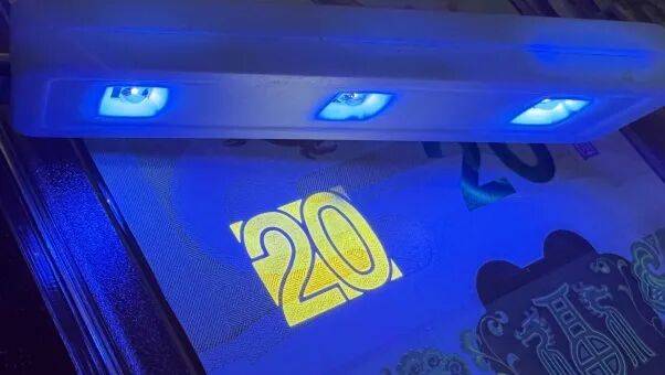 定制LED验钞灯,你可以用它去发现纪念钞隐藏在细节中的荧光纤维、微缩文字与水印便会清晰浮现。