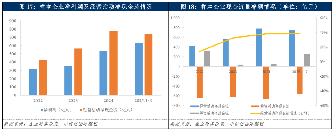 2024及2025年9月末样本企业平均资产负债率分别为45.72%以及47.56%,部分企业扩产项目推进及对外收并购带来的资金需求较高,使得样本企业整体资产负债率略有升高;但受益于盈利能力的提升,资本实力增强带动多家样本企业资产负债率有所下降,实现了从利润表到资产负债表的修复,整体资本结构较优。