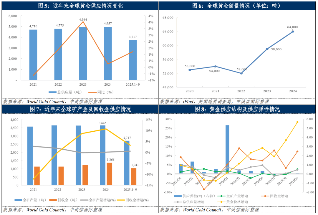 2025年以来矿产金供给增量有限,金价上行刺激回收金投放量升高但增速放缓,全球黄金供应整体较为稳定,不过黄金供应弹性相对较低,对金价影响不大。