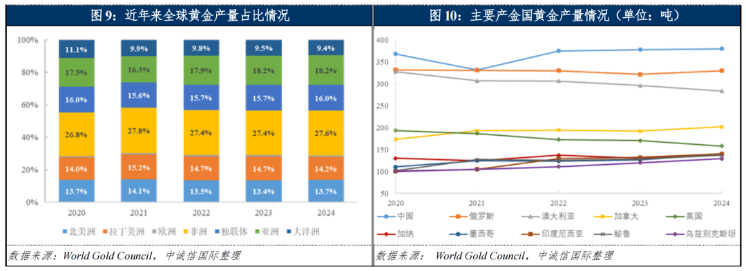从区域分布来看,各区域黄金生产趋势性变化不同,非洲及北美洲的黄金增量对拉丁美洲黄金产量的下降形成弥补。具体来看,非洲黄金矿产资源丰富且分布较广,近年来产量长期位于全球黄金产量首位,且随着多座矿山开发进程的加快,非洲矿山产量增长较快,2024年非洲矿产金产量突破1,000吨。我国为黄金生产第一大国,2024年以来在黄金价格大幅上涨的背景下各黄金企业加速推进增储上产,2025年前三季度国内原料产金为271.78吨,同比增长1.39%。其他国家方面,加纳、加拿大、澳大利亚及俄罗斯新项目及改扩建项目推进亦带来一定的矿产金增量。